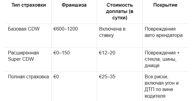 Что входит в цену? Расшифровка страховок (CDW, Super CDW) и франшизы